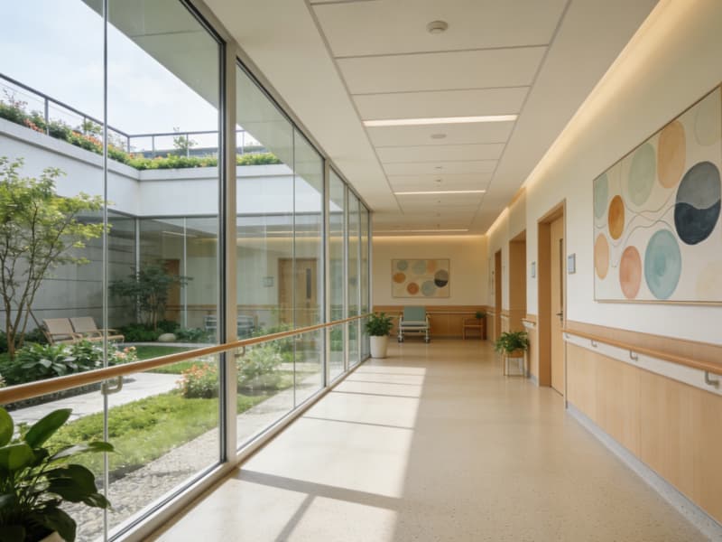 康復(fù)區(qū)與屋頂花園相連,通透的玻璃隔斷讓自然光線充分進(jìn)入,地面采用防滑且富有彈性的材質(zhì),墻面懸掛療愈系畫作,患者可在此享受陽(yáng)光與綠植的雙重滋養(yǎng)。