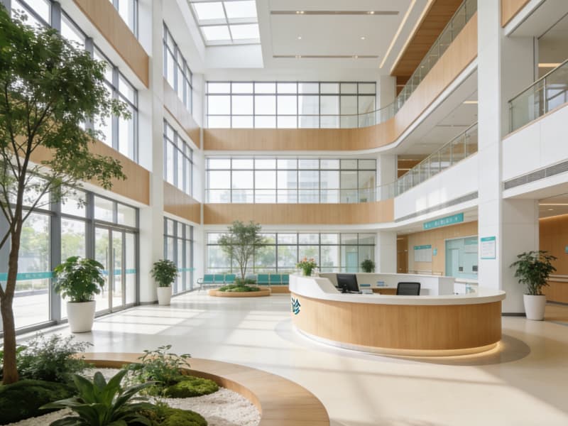 本設(shè)計(jì)以“療愈共生”為核心理念,為合肥這座綜合醫(yī)院構(gòu)建兼具功能性與溫度的空間。外觀采用柔和的曲線與淺米色石材,搭配錯(cuò)落的玻璃開(kāi)窗,打破傳統(tǒng)醫(yī)療建筑的刻板印象,墻面局部嵌入垂直綠植帶,讓自然氣息從建筑表皮便開(kāi)始滲透。