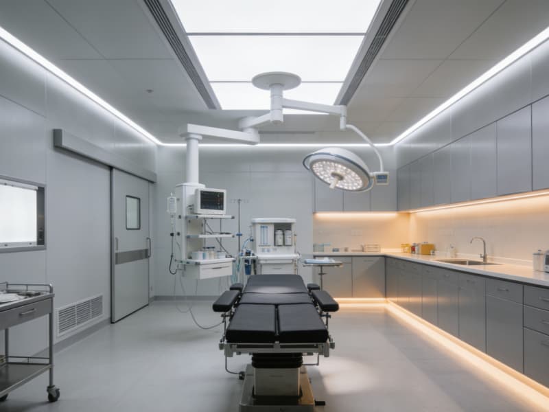 手術(shù)室區(qū)域以潔凈的灰白色為主,搭配暗藏式燈帶與防菌墻面,動(dòng)線設(shè)計(jì)清晰流暢,確保高效運(yùn)作的同時(shí),通過(guò)局部的暖光點(diǎn)綴弱化冰冷感。