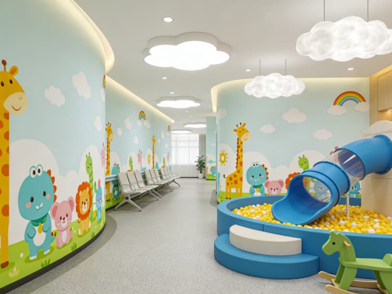 兒科專區(qū)則融入柔和的弧線與低飽和的馬卡龍色調(diào),墻面繪制童趣圖案,候診區(qū)設(shè)置小型游樂(lè)角,用輕松氛圍緩解孩童對(duì)就醫(yī)的恐懼。整個(gè)空間在保障醫(yī)療功能的同時(shí),讓自然與人文關(guān)懷貫穿始終。