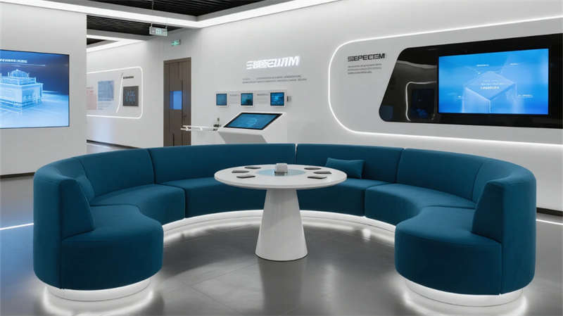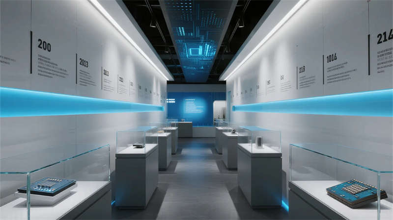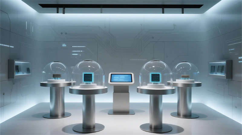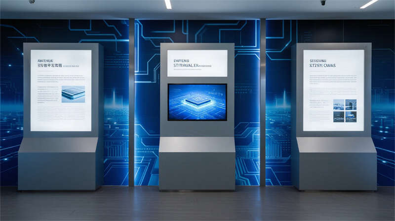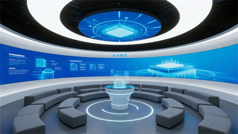 該半導體企業(yè)展廳以現(xiàn)代簡約風格為核心,通過流暢空間布局與高科技元素,打造沉浸式科技體驗。設計突出半導體技術的抽象表達,利用藍色與灰色調營造冷靜、專業(yè)的氛圍,同時融入玻璃、金屬材質增強通透感。入口區(qū)以懸浮雕塑引導視線,產品展示區(qū)通過簡約玻璃柜和觸屏互動,生動呈現(xiàn)技術精髓;技術創(chuàng)新墻以動態(tài)圖文展現(xiàn)工藝演進,歷史廊道則以線性敘事喚起行業(yè)記憶。互動區(qū)和未來展望區(qū)強調參與性,采用環(huán)形屏幕與全息投影,讓訪客直觀感受創(chuàng)新應用。休息區(qū)與演講區(qū)注重人性化,簡約家具結合微光紋理,提供舒適交流空間。整體設計摒棄繁復裝飾,以干凈線條和光影變化強化空間流動性,不僅傳遞半導體領域的精密與前瞻性,更通過美學融合提升教育性和觀賞性。展廳作為科技展示平臺,旨在激發(fā)探索興趣,體現(xiàn)企業(yè)對創(chuàng)新文化的重視。